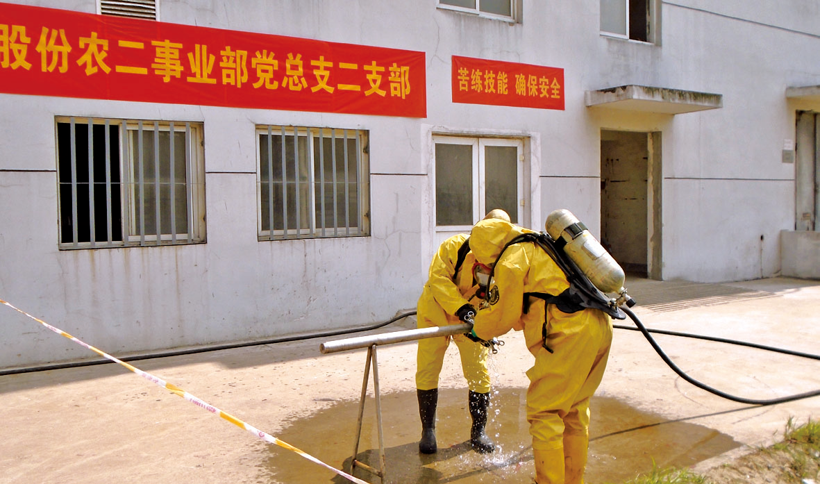 6月6日下午農(nóng)一事業(yè)部雙甘膦分廠組織氨回收送農(nóng)二事業(yè)部液氨管道泄漏預(yù)案演練,事業(yè)部總經(jīng)理孟長春擔任演練總指揮。6月19日,I草丙班與雙甘膦丙班聯(lián)合進行了液氨槽裝卸管道泄漏演練。演練前值長按照以往演練出現(xiàn)問題對原預(yù)案進行了修改,并且進行了泡沫消防炮、防化服穿戴專項訓練。