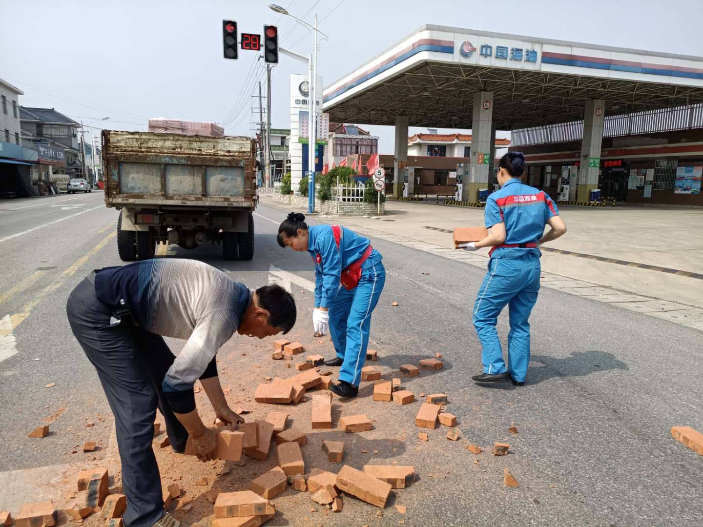 夏天的中午,天氣炎熱,似乎連樹上的知了也停止了歌唱。華東銷售南通公司栟茶加油站站前道路,似乎和往常一樣,車輛人流來來往往,當班的繆小紅和蔡翠和頂著炎熱在加油島上等待下一個顧客來加油。突然,“吱呀~~~”一個急剎,一輛避讓行人的運磚車差點翻車,晃悠了幾次總算停穩了,但是車上的磚塊紛紛滾落。后方行駛的車輛有些來不及避讓,差點釀成新的事故,散落的磚塊對道路交通安全構成隱患。司機驚魂未定,趕忙下車查看,立刻開始將散落在道路上的磚往車上搬。